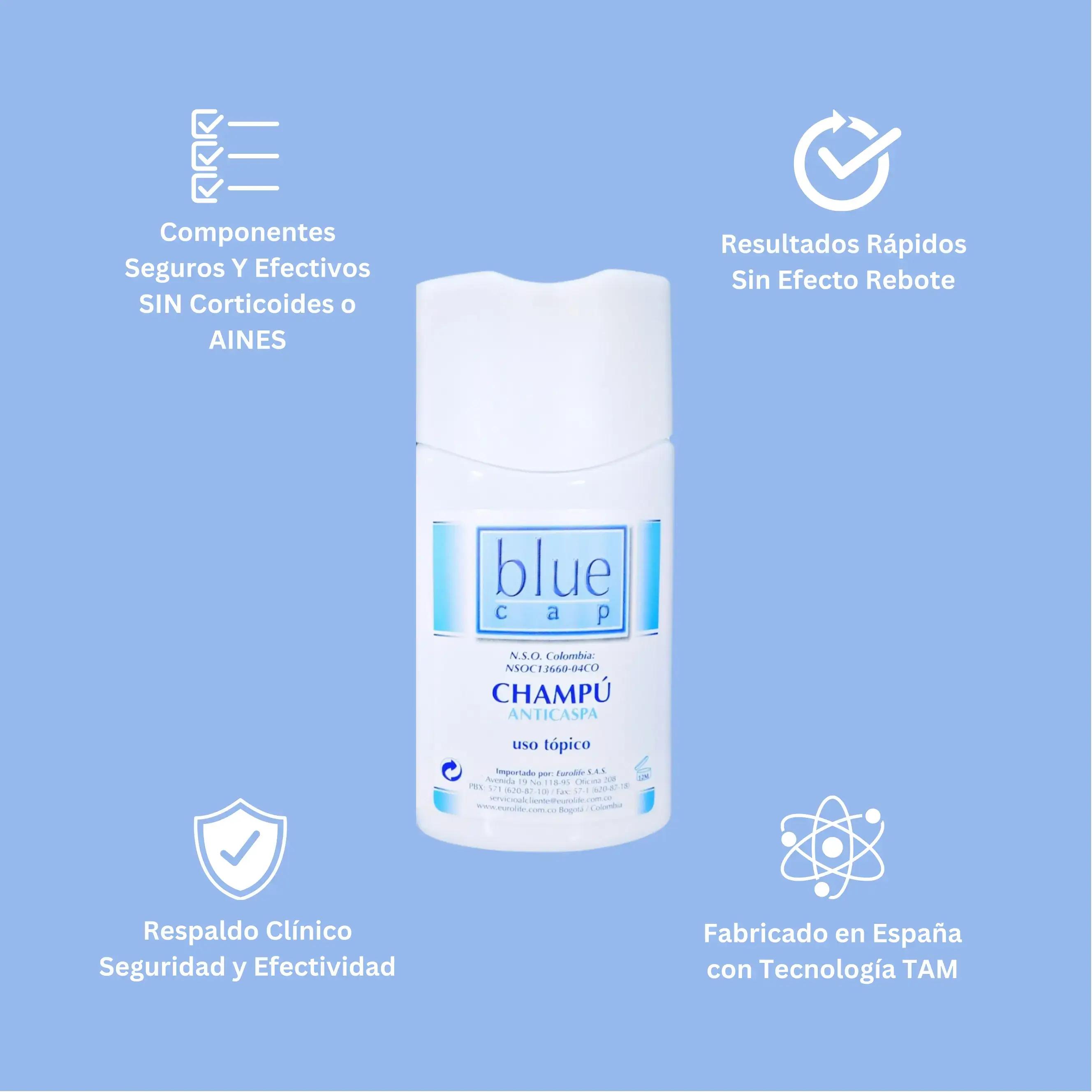 En caso de caspa se recomienda usar una pequeña cantidad de Blue Cap luego de lavar con un shampoo normal el cuero cabelludo.